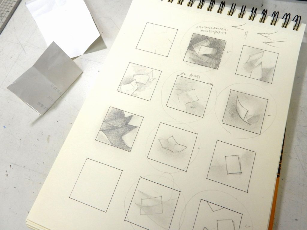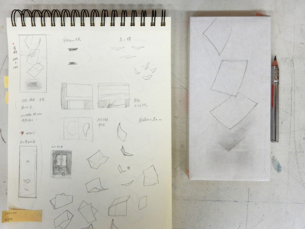 絵のイメージがある程度固まったら、使う紙を決めて必要な寸法を割り出す。