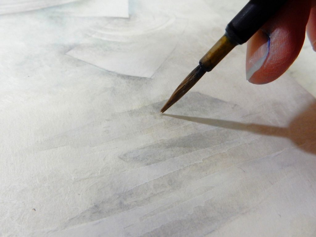 水干絵具と和紙の織り成す、細かな滲み、光るような風合いが好きです。