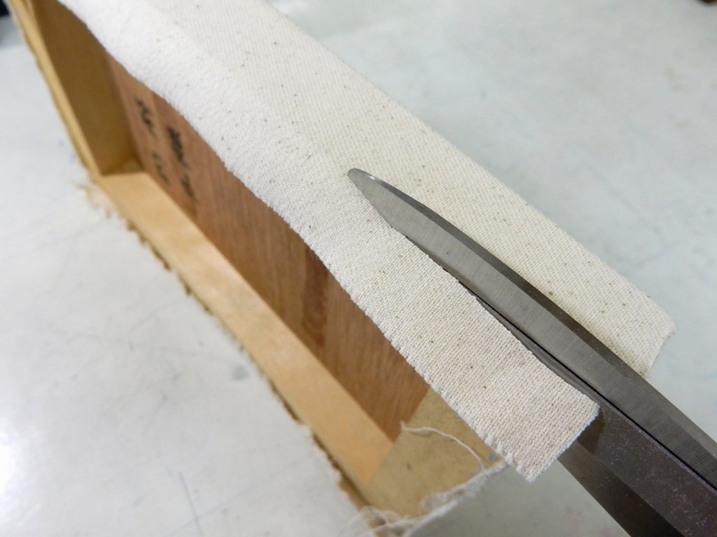 - 膠を引いて布をのばしてから張り込む